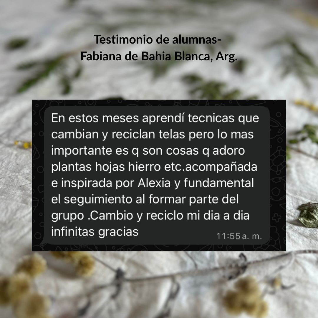 Hola!! Soy Stephie de Buenos Aires, y estoy suuuper contenta y me re gustó el tutorial de ecoprint, fue súper claro y didáctico. Estampe lienzo de algodón, y las estampas no me salieron tan bien porque las hojas estaban medias quemadas por el sol 🙁 🙁 , pero es algo para mejorar. Pero igual voy a seguir probando. Te recomiendo que tomes este cursito, porque Alexia explica re bien y te da y transmite ganas de empezar en esta técnica tan hermosa!